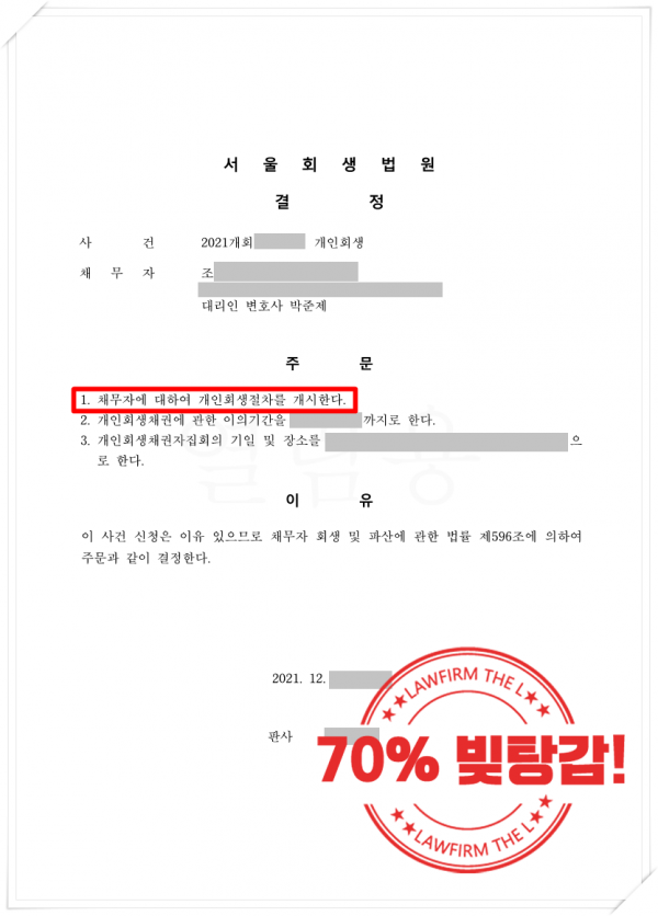 분류 개인회생 고이율의 대부업체에서 대출을 받아 막막했었던 의뢰인의 개인회생 작성자 정보 작성자 최고관리자 작성일 2022.06.27 12:24 컨텐츠 정보 조회 4,638 목록 답변 글쓰기 본문 <개요>직업 : 급여소득자소득(월) : 약 190만원채무 : 약 4700만원변제계획 : 약 60만원 x 24개월변제율 : 원금의 약 30%<사건 내용>일찍이 부모님이 이혼하시고 경제적으로 풍족하게 자라지 못한 의뢰인은 몸이 안좋아 수술을 위해 대출을 알아보기 시작했습니다. 하지만 대출심사 부적합으로 1,2금융권의 대출을 이용하지 못하게 되어, 급하게 수술비용이 필요했던 의뢰인은 결국 대부업체를 통해 대출을 받아 수술비용을 마련했습니다.하지만 1금융권과 달리, 대부업체 대출상품의 높은 이율로 꾸준히 상환했음해도 불구하고 채무가 줄어들기는 커녕 점점 불어나기 시작했습니다. 이에 의뢰인은 신용카드 리볼빙 및 카드 장기대출을 통해 돌려막기를 하였고 더이상 대출이 불가능한 상황까지 이르러 어느새 본인이 감당하기 힘든 채무액수에 앞길이 막막한 상태였습니다.이에 채무가 과도하여 상환이 어려운 분들에 한해 채무조정을 해주는 개인회생 제도를 알아보았고 저희 사무실에 의뢰를 주셨습니다. 저희 법률사무소 더엘은 의뢰인의 최초 채무 발생 경위 및 채무 증대 사유를 꼼꼼히 체크하여 의뢰인에게 알맞는 변제계획안을 세웠고 철저한 검토를 통해 개인회생 개시신청을 하였습니다.<더엘의 조력>의뢰인의 나이가 아직 어린 점, 채무를 빠르게 해결하고 신속히 사회에 복귀하여 다시 건강한 신용생활을 영위해야 한다는 점을 법원에 강력히 주장하여 변제기간 또한 기본 변제기간 36개월에서, 1년을 축소시켜 24개월로 최종 개시결정 받아 현재까지 성실히 변제금을 납부하고 있으신 사례입니다. <더엘의 소감>소득은 한정되어 있어 고이율의 대출을 돌려막기 하는데 급급했었지만, 의뢰인에게 최대한 유리한 방향으로 변제계획을 잡고 법원에 여러차례 요구하여 좋은 결과를 얻어 의뢰인도 만족하고 저희도 크게 보람을 느꼈던 사례였습니다.위 사례처럼 변제기간을 2년까지도 줄일 수 있고, 계속해서 성공사례들을 만들어 내고 있으니 구체적 사항은 대표번호 1668-3228 로 전화 및 카카오톡 상담 신청해주시면 자세한 상담 도와드리도록 하겠습니다. 감사합니다. 관련자료 이전 제주지방법원 64% 빚탕감 성공사례 작성일 2022.08.25 13:10 다음 보이스피싱 피해로 거액의 빚을 떠앉게 된 의뢰인의 개인회생 작성일 2022.06.23 17:36 댓글 0개 등록된 댓글이 없습니다. 목록 답변 글쓰기